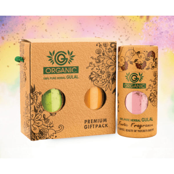 ₹349.00Pet Jars with 80gm Organic Herbal Gulal, Attar 2.5ml, Mini Pichkari Balti and 2 Empty Bowls Platter (3.5 Inch) in box. All packed in Gift Box – Craft Paper 18.5x10x11.5cm B33